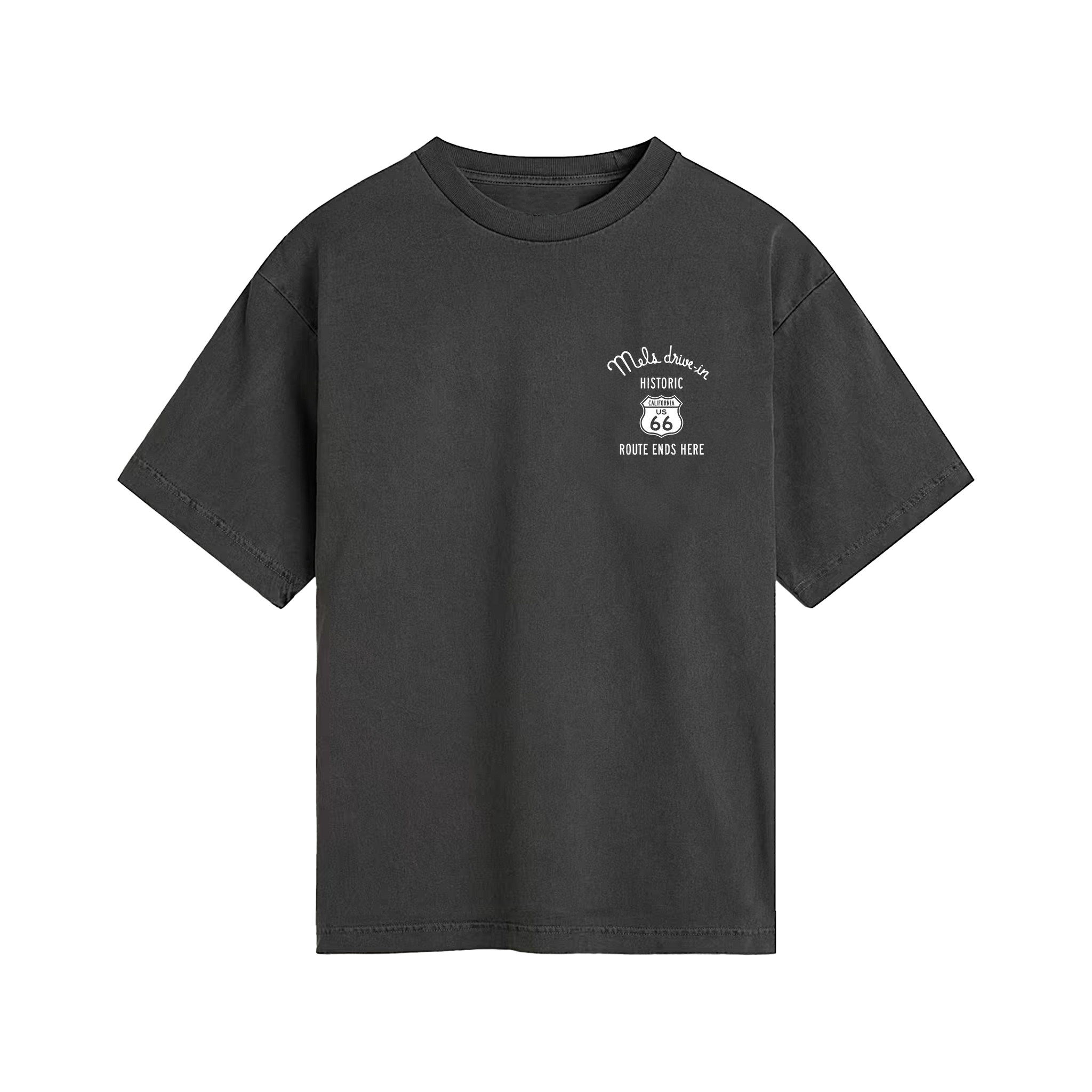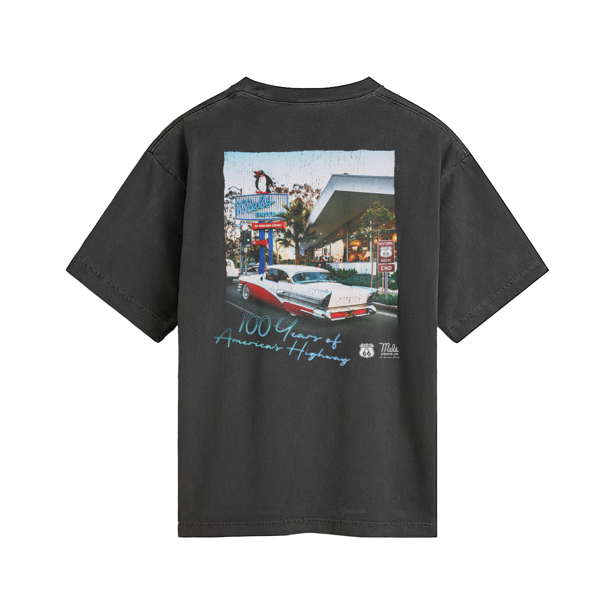 From Chicago to the coast, Mel’s Drive-In stands as the official end of the road. This limited shirt commemorates the 100-year legacy of Historic Route 66 (1926–2026). Featuring a vintage washed black custom 100% cotton base and a handmade print, it offers a timeless look for the centennial year.